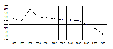 Рис.2.1 Доля наличных денег вне касс банков в общей сумме денежной массы в России с 1997 по 2008 гг.