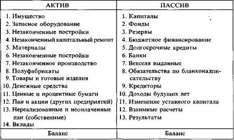 Совершенствование отчетности в то время шло по линии усложнения и унификации структуры основной отчетной формы - баланса. Так, согласно инструкции ВСНХ СССР «Формы годового отчета и баланса на 1 октября 1929 г.» типовая форма баланса хозоргана, подведомственного ВСНХ (треста, синдиката, акционерного общества), включала 14 разделов статей в активе и 13 разделов в пассиве (табл. 2). Примерно такой же дробностью отличался баланс торговых предприятий, подведомственных Наркомторгу СССР.