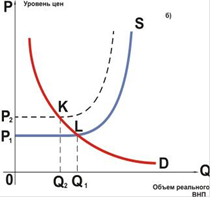 Если экономика находится на отрезке KL кривой спроса D, то объем ВНП будет сокращаться, а цены расти.