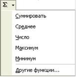Рядом с кнопкой Автосумма находится значок выпадающего списка, с помощью которого можно ввести еще несколько часто встречающихся функций (Рис. 2.4). Используются эти функции аналогично функции вычисления суммы.