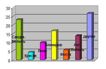 Исследую рекламу на страницах наиболее популярных газет и телерекламу, было выявлено, что в г. Сумы существует несколько предприятий, занимающихся производством и реализацией мебели, а также несколько фирм, продаваемых мебель. Среди них такие как: мебельная фабрика "Нильс", ЗАО "Сакура", мебельный салон "Кристи", сеть магазинов "Сакура-Мебель", фирма "Люкс", ООО "Командор". Это далеко не полный перечень, но остальные не настолько велики, чтобы выступать в качестве конкурентов. Рассмотрим какую долю рынка занимает каждая из этих фирм (Рисунок 3.1).