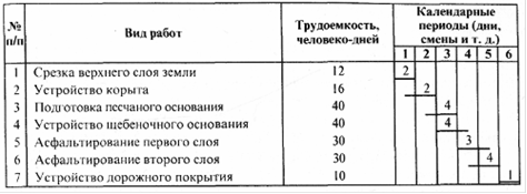 Более наглядно календарный план можно представить в виде линейных диаграмм, или графиков Ганта (названных по имени Генри Ганта, который впервые использовал их). На рис >. 1.1 приведена линейная диаграмма выполнения дорожного покрытия. Такие ленточные (поэтапные) графики применяются при планировании сравнительно несложных работ и объектов, не содержащих элементов риска. Если же риск предвидится, то фактор риска включают в расчет трудоемкости работ или затрат. По горизонтали откладывают календарные периоды (дни, смены, декады, месяцы и другие временные отрезки), а по вертикали проставляют последовательно виды работ. Эти графики достаточно просты и наглядны, но имеют существенные недостатки. В них не отражается взаимосвязь между отдельными работами, по ним трудно выделить работы, сроки выполнения, которых надо сократить, особенно когда они выполняются параллельно и параллельно-последовательно.