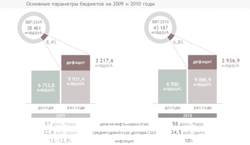 Бюджет 2010 года спланирован исходя из прогнозируемого объема ВВП в размере 43 187,0 млрд. рублей и уровня инфляции, не превышающего 10 процентов. Поступления в доходную часть федерального бюджета 2010 года спланированы в сумме 6950 млрд. рублей (в 2009 году - 6713,82 млрд. рублей), в том числе объем нефтегазовых доходов запланирован в сумме 3 194,7 млрд. рублей. При этом расходы федерального бюджета определены в размере 9886,9 млрд. рублей (в 2009 году - 9931,4 млрд. рублей). Таким образом, прогнозируемый дефицит федерального бюджета 2010 года установлен на уровне 2936,9 млрд. рублей.