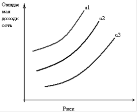 Для формирования инвестиционного портфеля главным является определение инвестиционной цели инвестора. Согласно современной теории портфеля цели инвестора проявляются в его отношении к риску и ожидаемой доходности. Одним из широко применяемых методов определения таких целей является построение кривой безразличия (indifference curve), характеризующей предпочтения инвестора. На рис. 1 обозначены кривые безразличия u1, u2, u3. На горизонтальной оси откладывается значение риска, а на вертикальной - ожидаемые доходности.