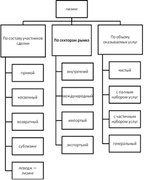 Существует множество классификаций лизинга по различным признакам. В рисунке 1 приводится три наиболее значимые.